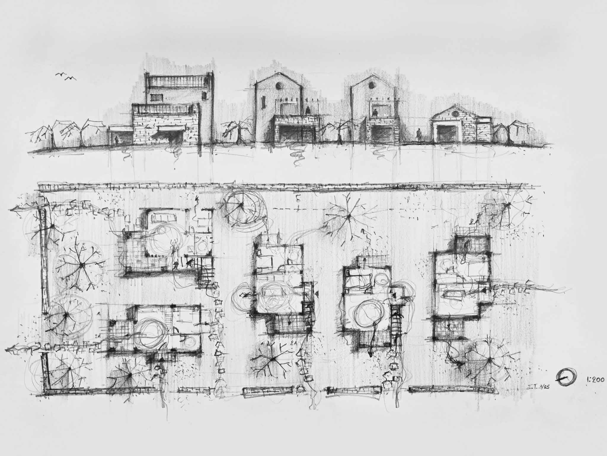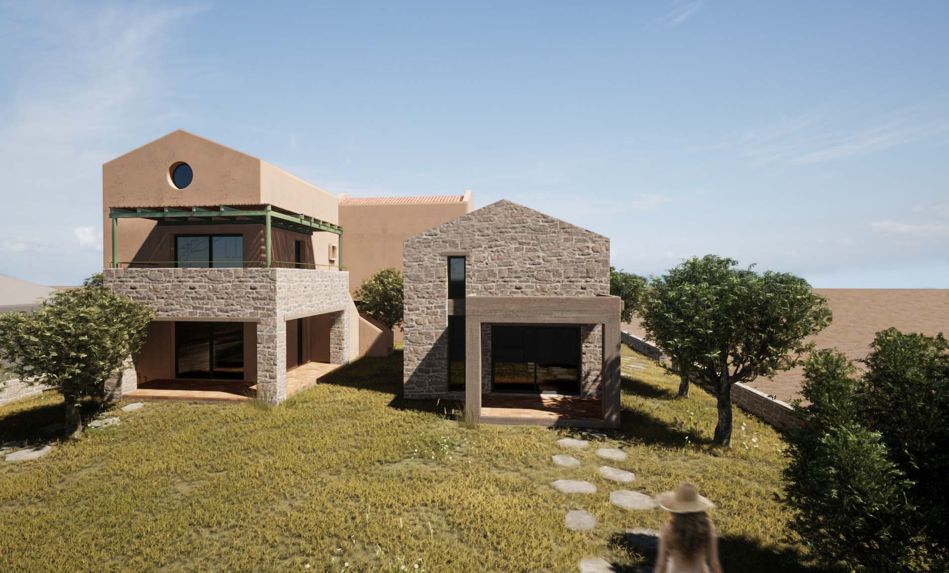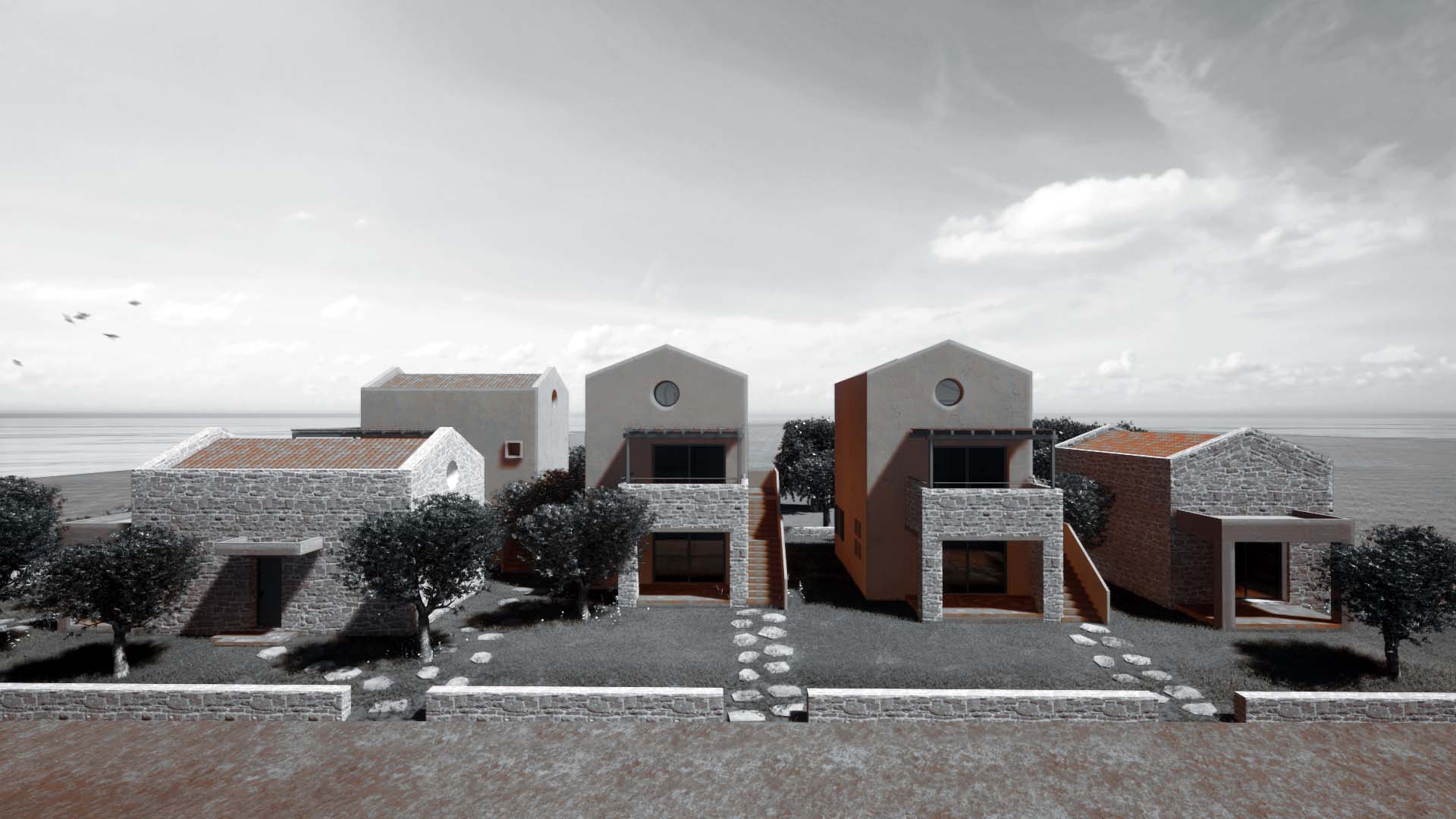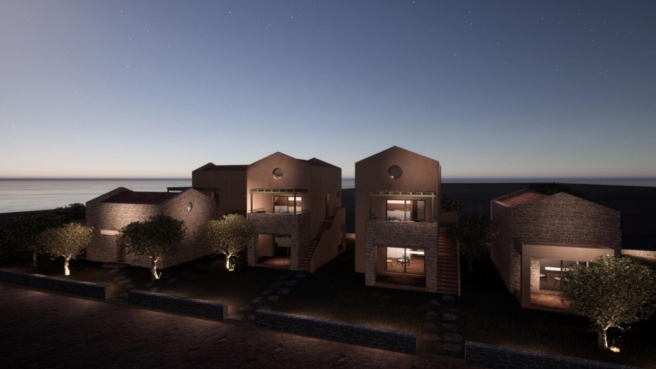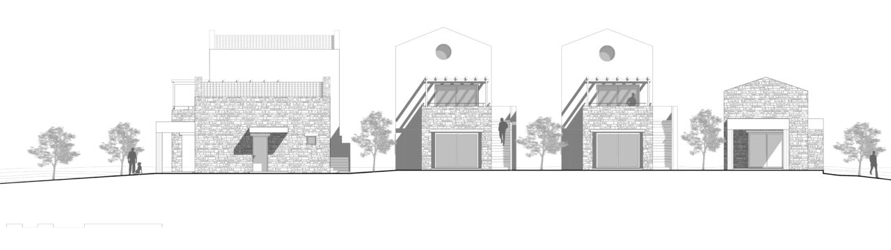 Το οικόπεδο, βρίσκεται στην σκάλα Ραχωνίου της Θάσου, και είναι εντός οικισμού. Είναι πολύ κοντά στη θάλασσα, και το πολύ σημαντικό και ενδιαφέρων στοιχείο, αποτελεί, η ύπαρξη πολλών αιωνόβιων ελαιόδεντρων. Ως εκ τούτου, κίνητρο αποτέλεσε το γεγονός, του σεβασμού και της διατήρησης των περισσοτέρων δέντρων. Όλες οι σχεδιαστικές χαράξεις οι οποίες πραγματοποιούνται, υποδηλώνουν τη κτηριακή ένταξη στο φυσικό υπόβαθρο, ενώ παράλληλα , μέρος της σύνθεσης αποτελούν τα ελαιόδεντρα. Παράλληλα, προδιαγράφονται αφηγηματικές διαδρομές σε όλους τους υπαίθριους χώρους των κατοικιών, έχοντας ως κύριο στόχο την ανθρώπινη ένταξη στο περιβάλλον. Οι κατοικίες, οργανώνονται σε δυο επίπεδα, τα ισόγεια και οι όροφοι οι οποίοι συνδέονται με εξωτερικά κλιμακοστάσια. Τα υλικά τα οποία χρησιμοποιούνται, είναι, οι τοπικές πέτρες , τα φυσικά επιχρίσματα, καθώς και η terracotta την οποία την συναντάμε στα δάπεδα (προέκταση χωμάτινου υπεδάφους) καθώς και στα κεραμιδιά των στεγών.