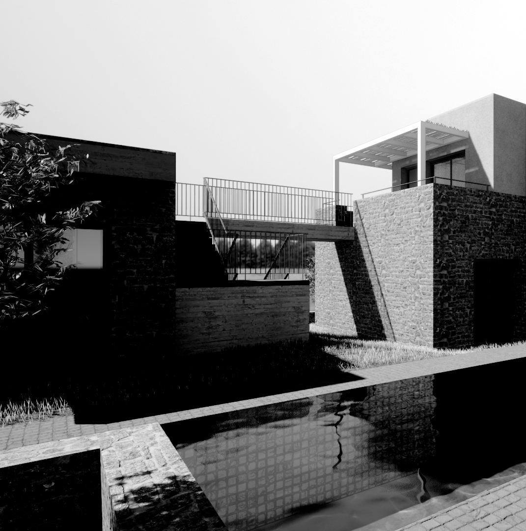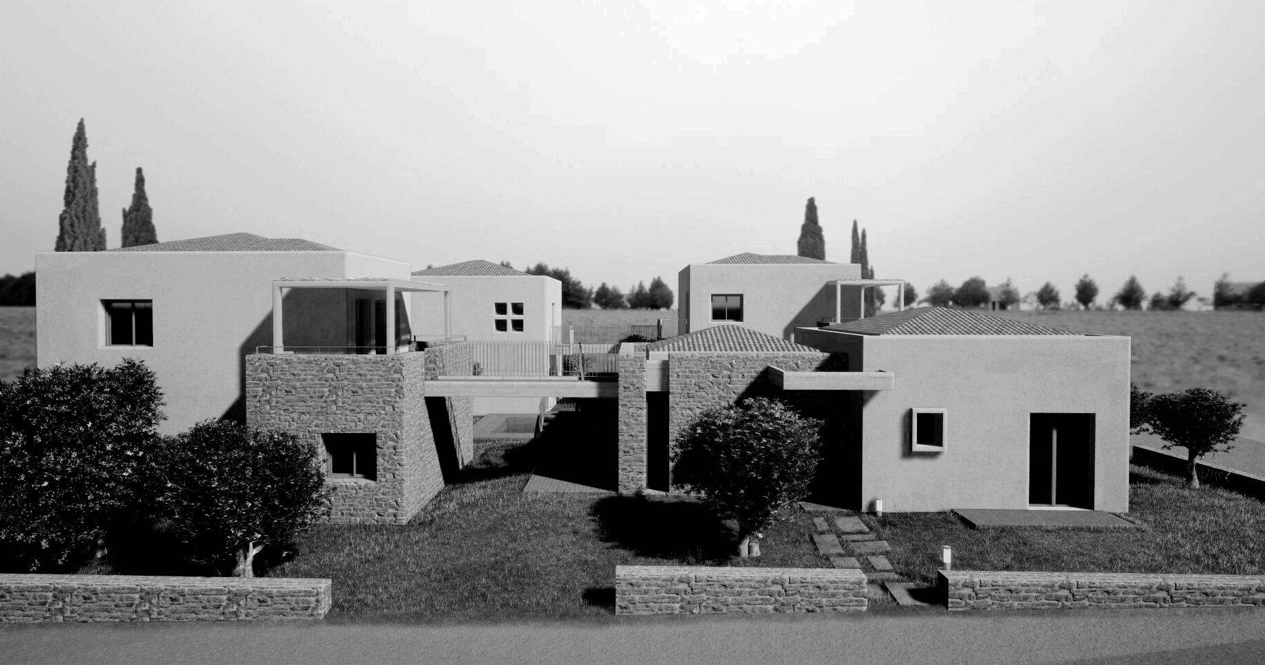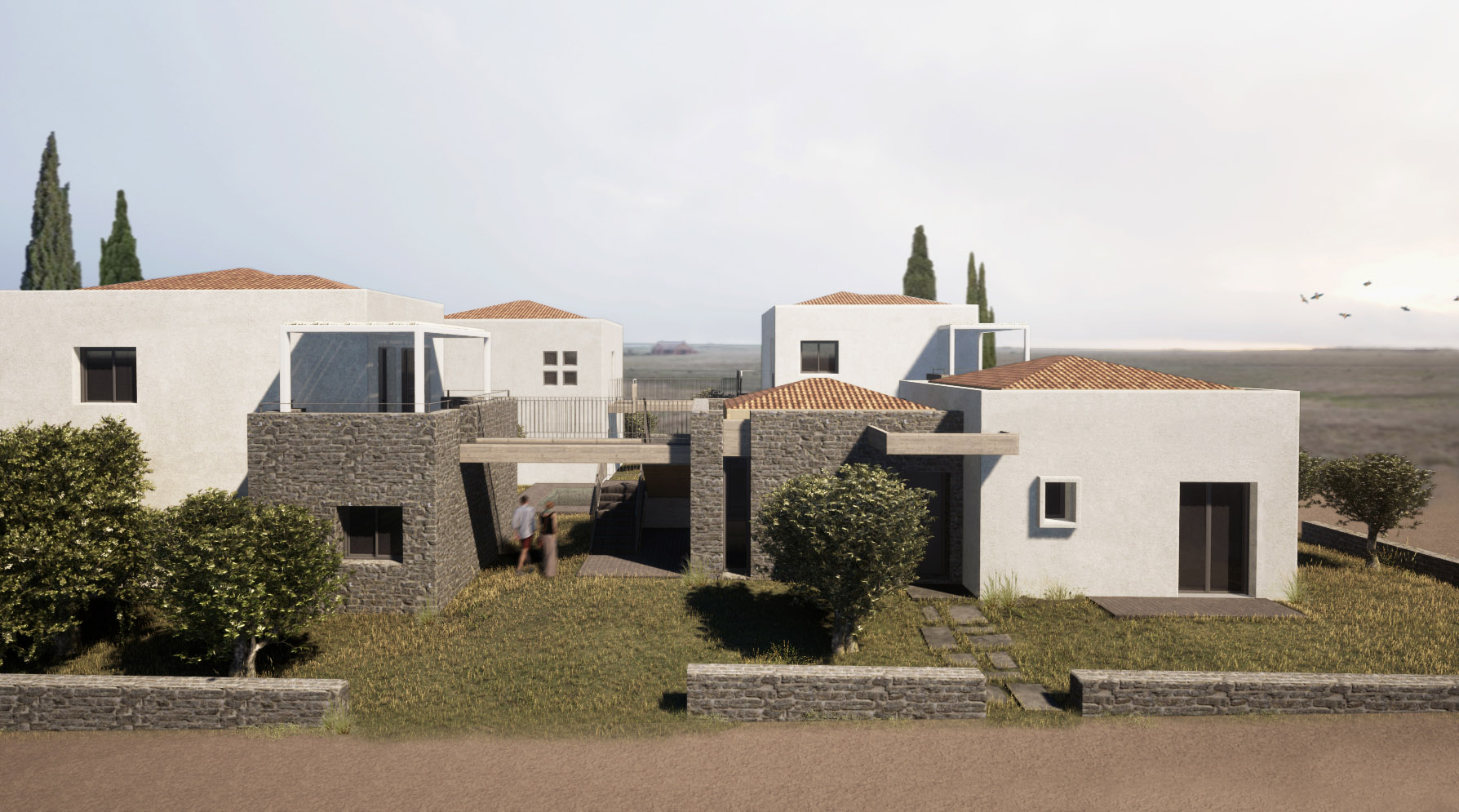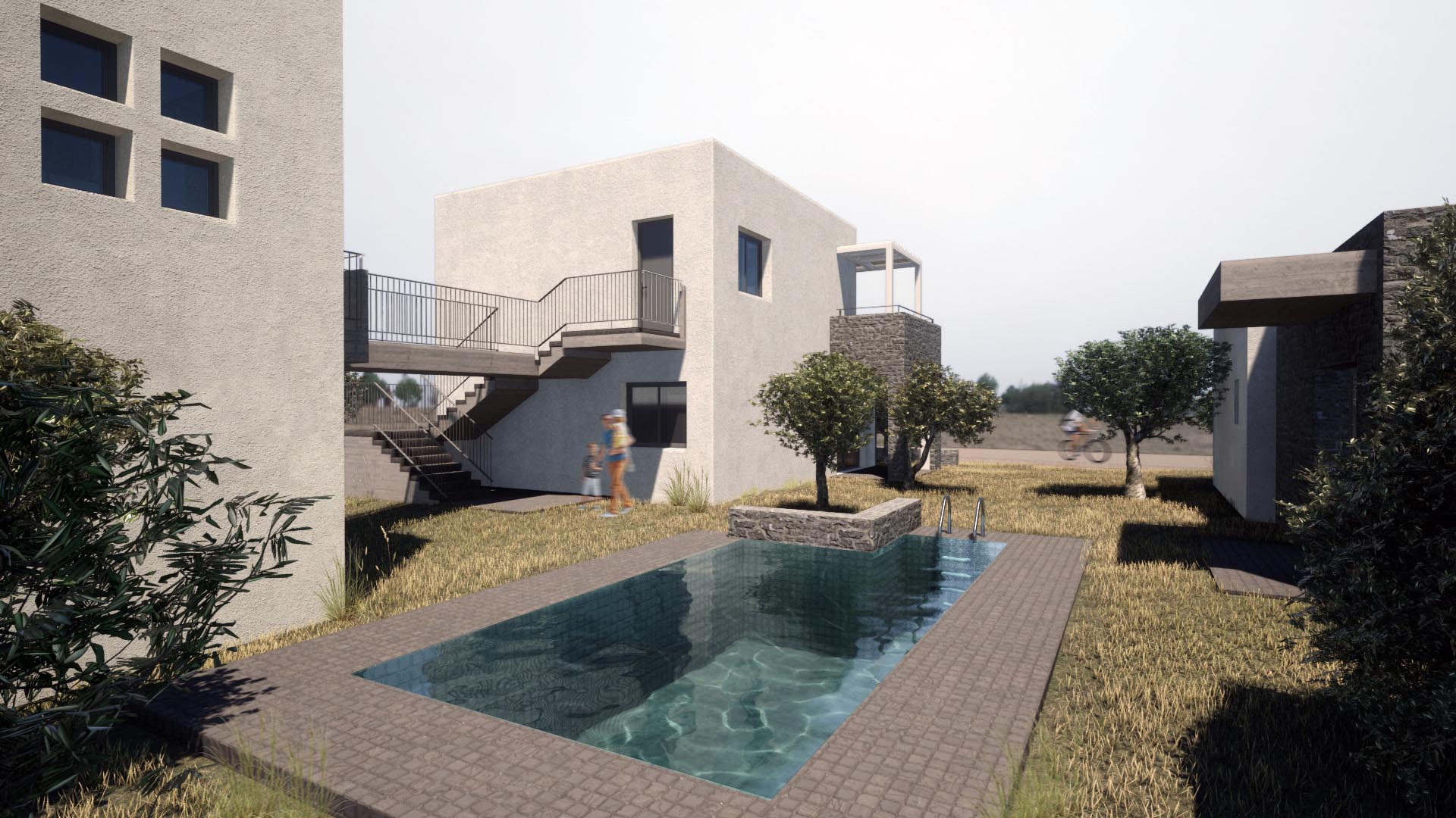 Εμφανής είναι ο κεντρικός πυρήνας (υδάτινο στοιχείο) οργάνωσης των οικιών, ο οποίος περικλείεται από τους χώρους διημέρευσης των διαμενόντων. Οι κατοικίες, οργανώνονται σε δυο επίπεδα, των ισόγειων διαμερισμάτων καθώς και των ορόφων. Στο ανώτερο επίπεδο, δημιουργούνται άπλετοι εξώστες χαλάρωσης και οπτικής θέασης του φυσικού τοπίου. Τα υλικά τα οποία χρησιμοποιούνται (τοπικά πετρώματα), προδιαγράφουν την Ελληνικότητα και την λαϊκή παραδοσιακή αρχιτεκτονική, η οποία αποδίδεται με σύγχρονα στοιχεία του μοντερνισμού.