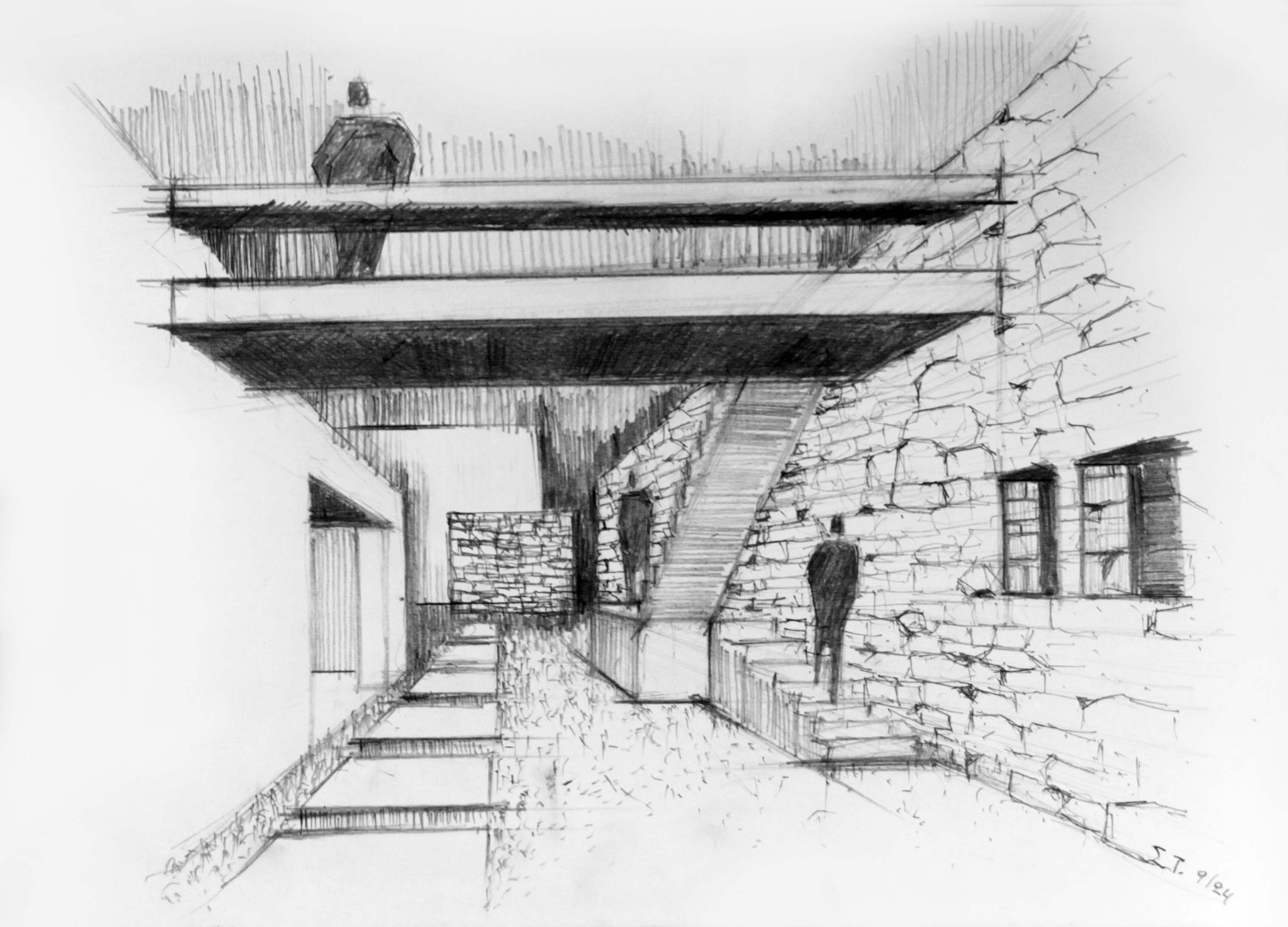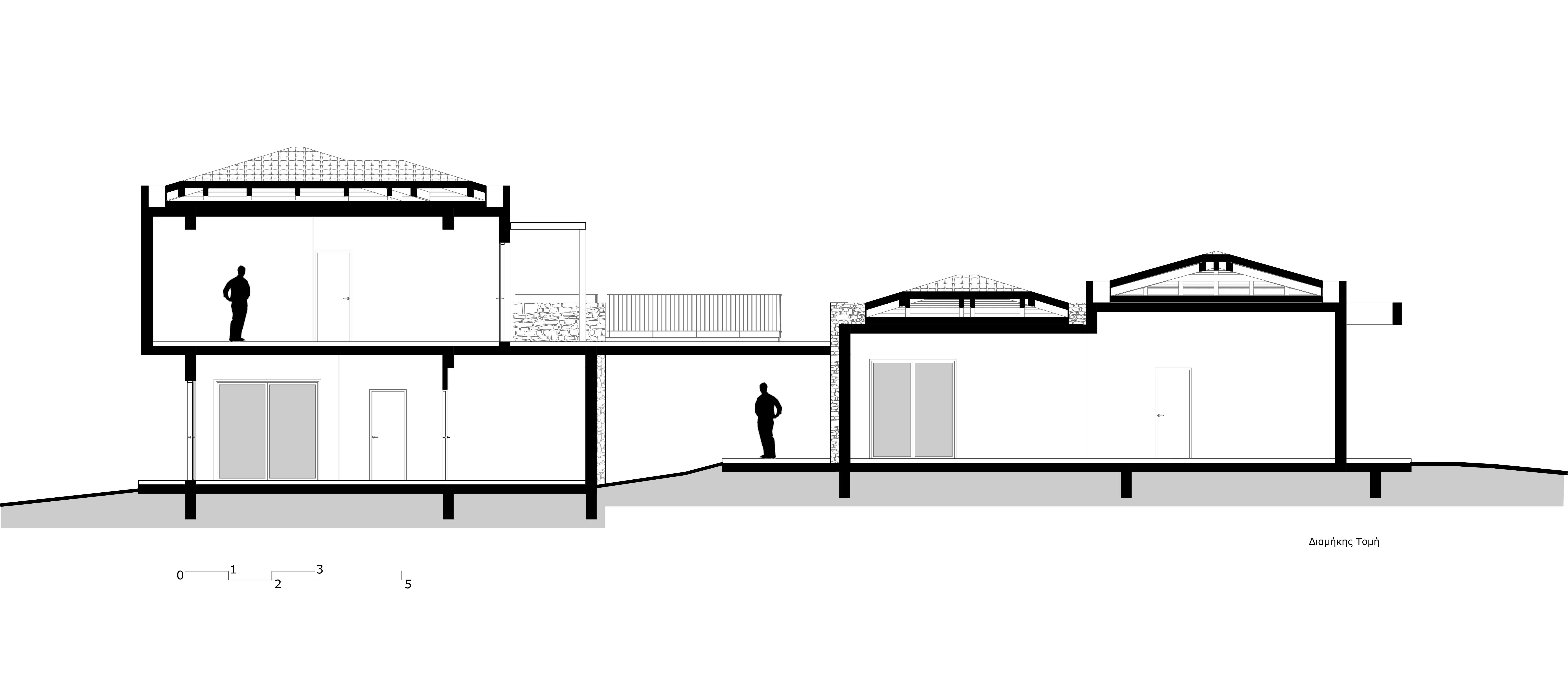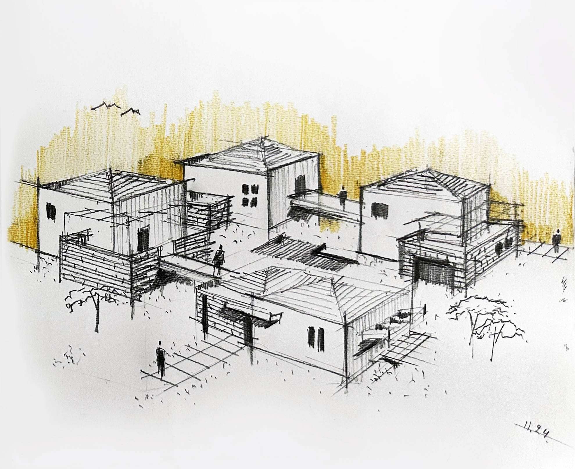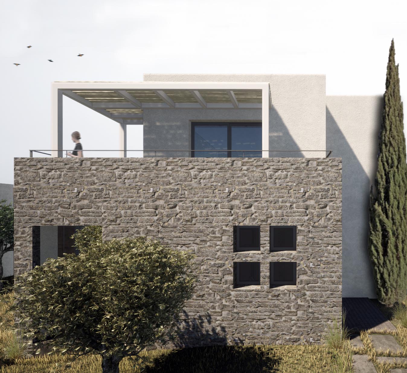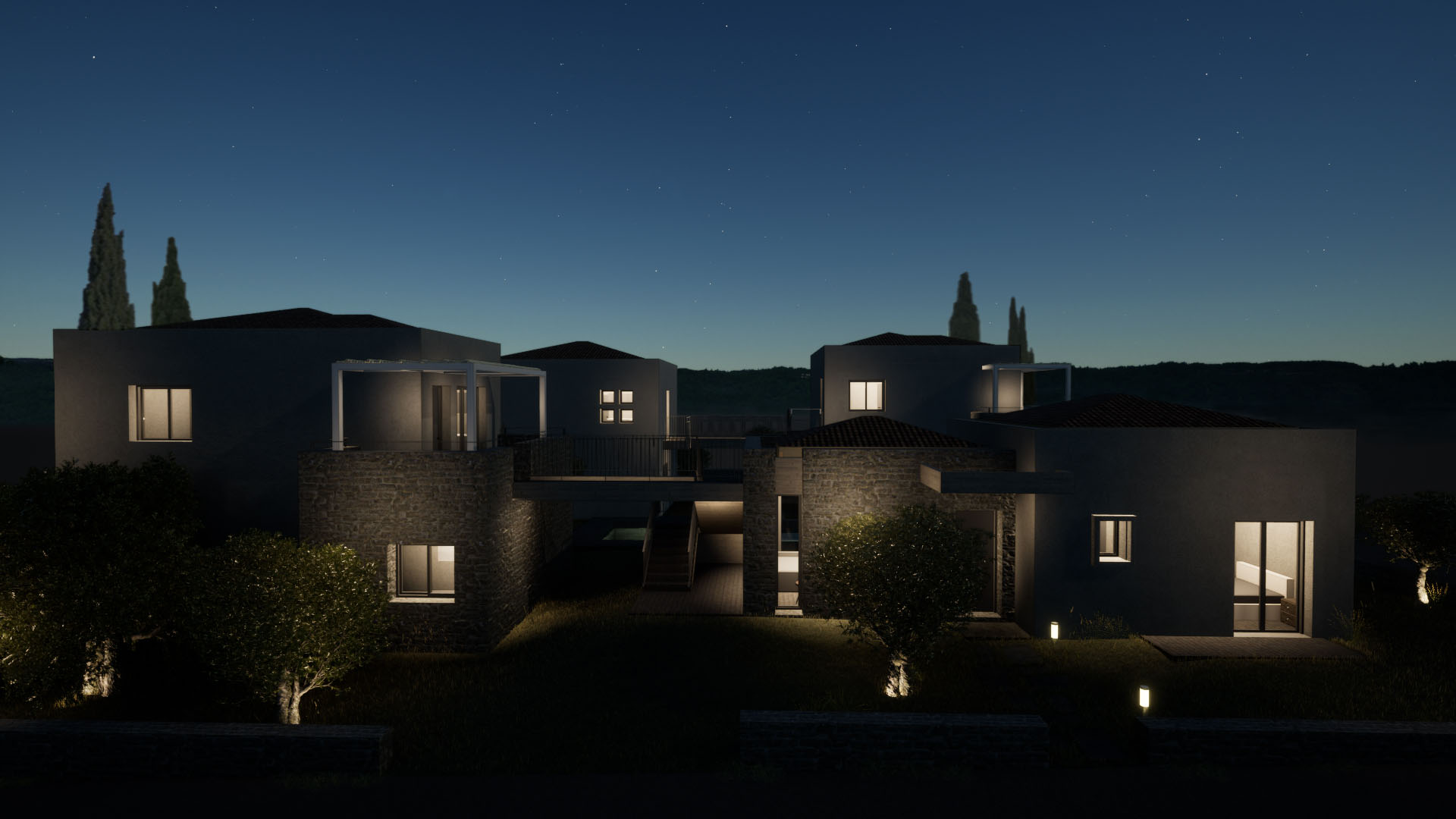 Εμφανής είναι ο κεντρικός πυρήνας (υδάτινο στοιχείο) οργάνωσης των οικιών, ο οποίος περικλείεται από τους χώρους διημέρευσης των διαμενόντων. Οι κατοικίες, οργανώνονται σε δυο επίπεδα, των ισόγειων διαμερισμάτων καθώς και των ορόφων. Στο ανώτερο επίπεδο, δημιουργούνται άπλετοι εξώστες χαλάρωσης και οπτικής θέασης του φυσικού τοπίου. Τα υλικά τα οποία χρησιμοποιούνται (τοπικά πετρώματα), προδιαγράφουν την Ελληνικότητα και την λαϊκή παραδοσιακή αρχιτεκτονική, η οποία αποδίδεται με σύγχρονα στοιχεία του μοντερνισμού.