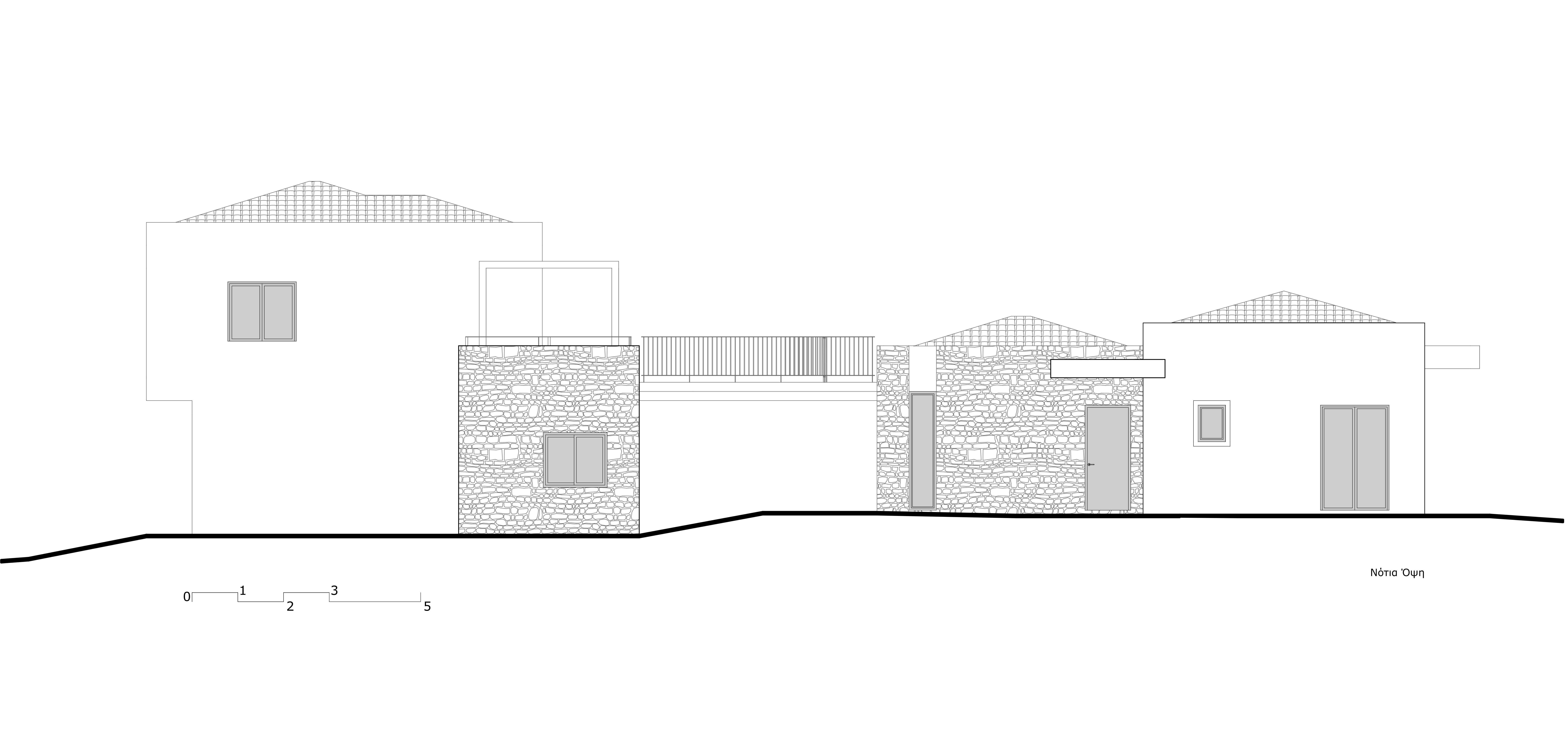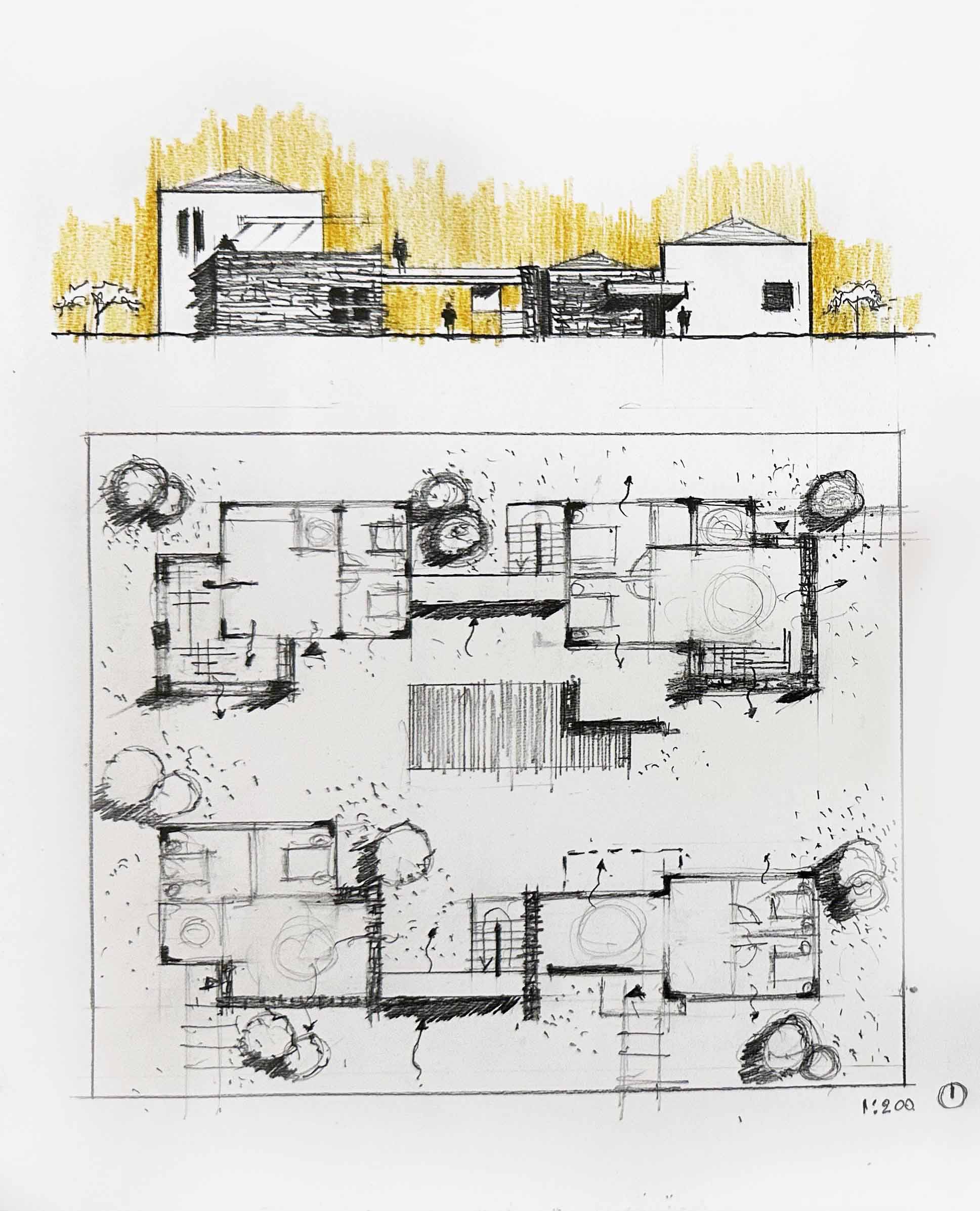 Το οικόπεδο, βρίσκεται στην σκάλα Καλλιράχης της Θάσου και είναι ενταγμένο μέσα στη φύση καθώς σε αυτό υπάρχουν πολλά ελιόδεντρα. Ως αφετηρία, της κεντρικής ιδέας, αποτέλεσε το γεγονός, του σεβασμού και της διατήρησης των δέντρων με ελάχιστες μετακινήσεις και μεταφυτεύσεις αυτών. Ως εκ τούτου τα διασπασμένα κτήρια των τεσσάρων όψεων, χωροθετούνται γύρω από τα δέντρα, διαγράφοντας αφηγηματικές διαδρομές. Επιπρόσθετα, οι τέσσερις κτηριακοί όγκοι, ενοποιούνται με την ζεύξη σκυροδετημένων διαδρόμων οι οποίοι δημιουργούν παράλληλα υμιυπαίθριους χώρους.
