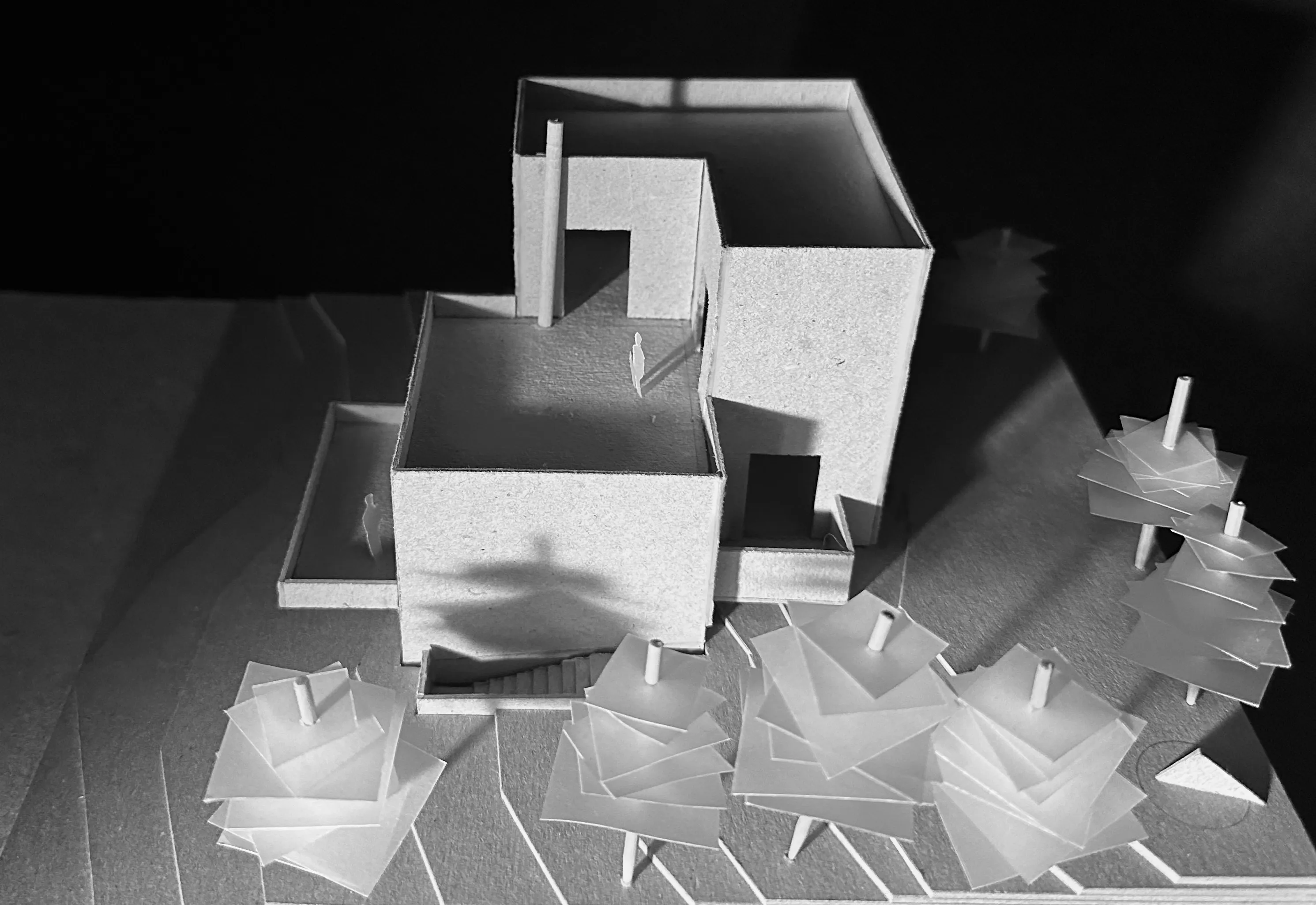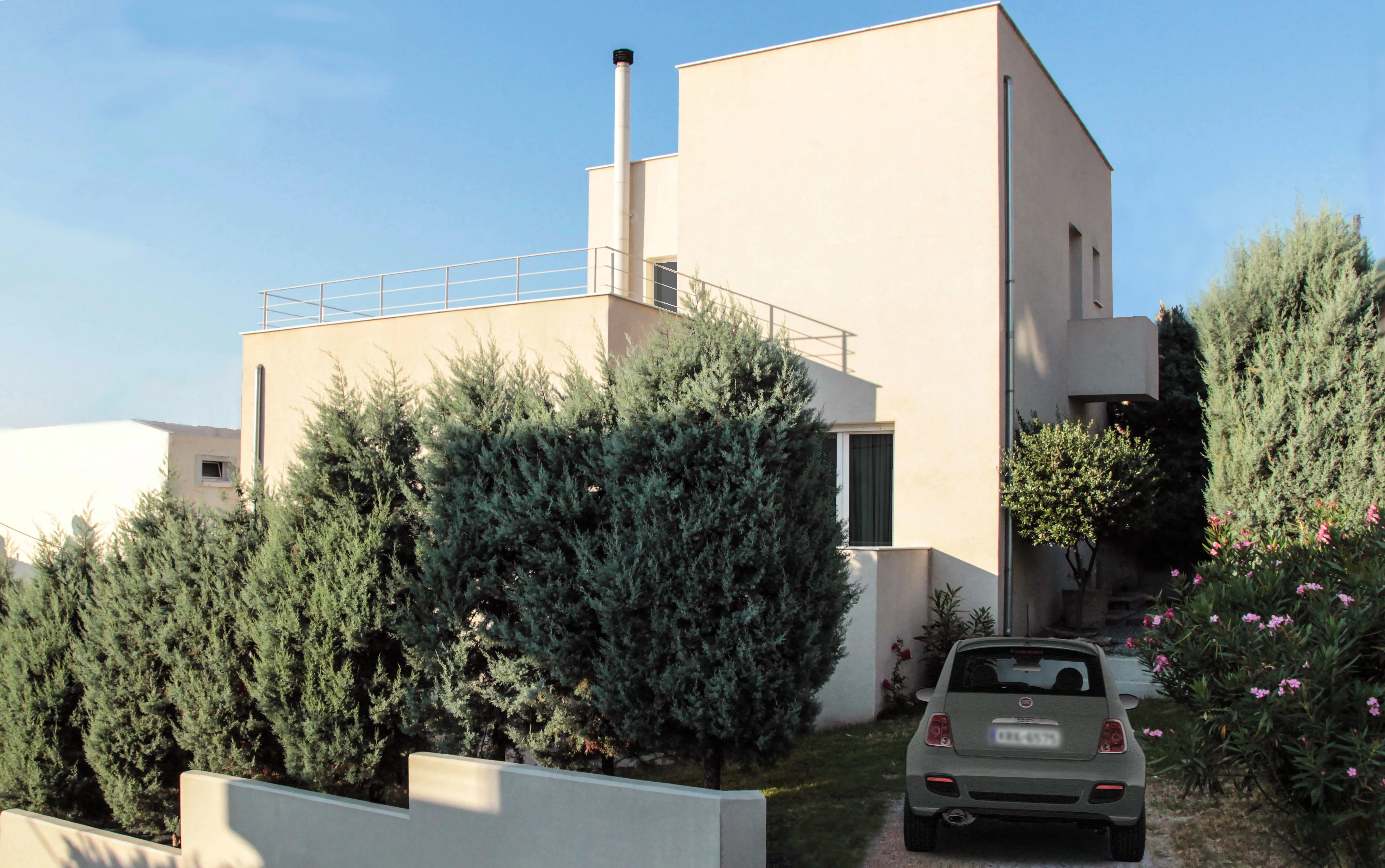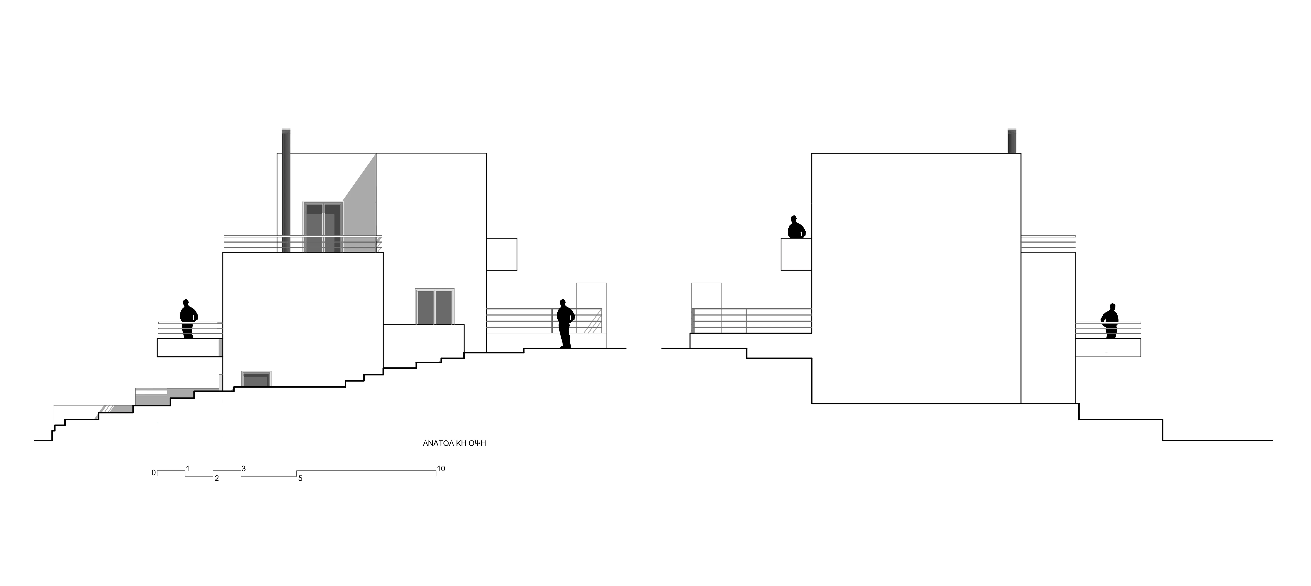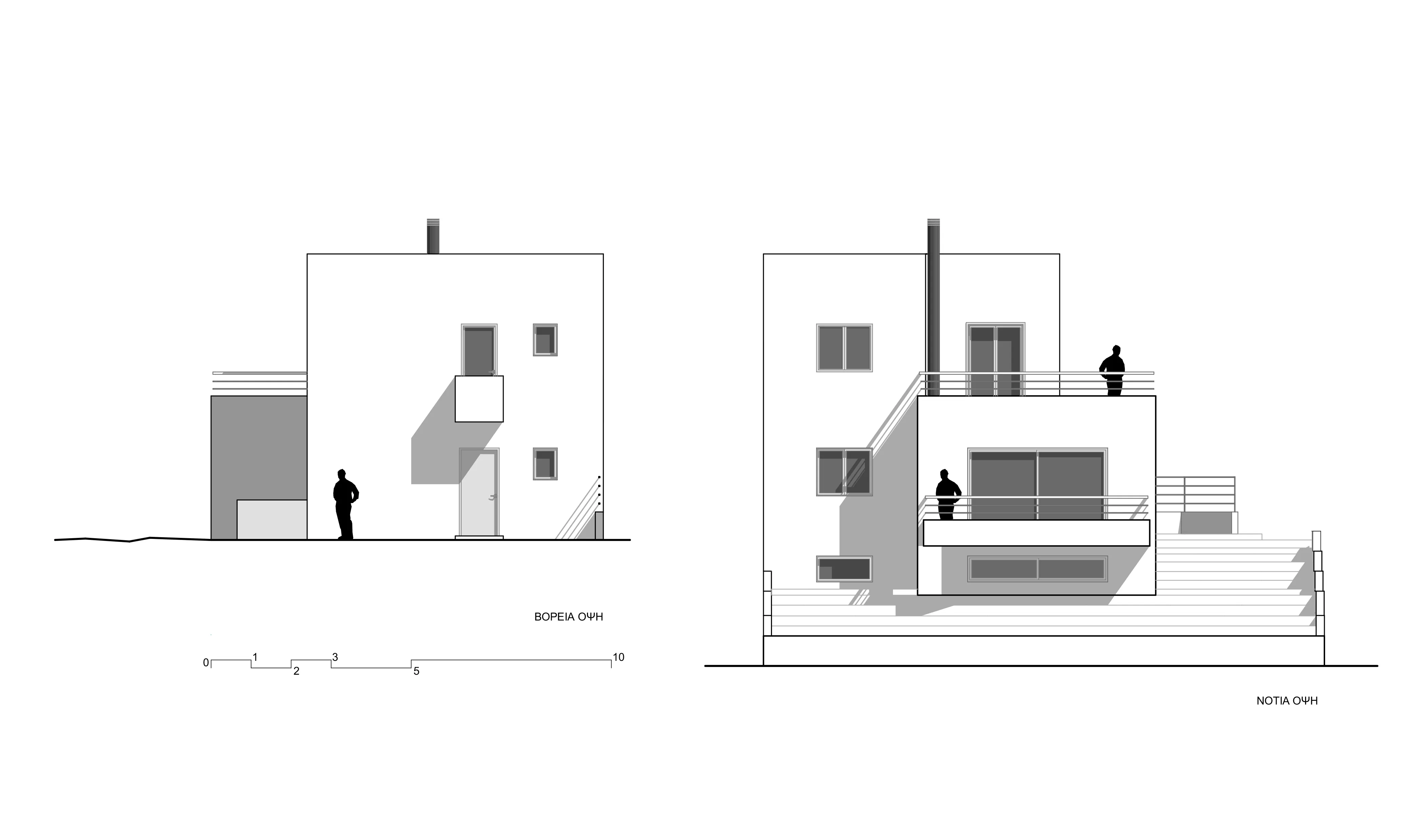 Επιπρόσθετα, η έντονη κλίση του υπεδάφους καθόρισε την δημιουργία αναβαθμών στον περιβάλλοντα χώρο ακολουθώντας το ανάγλυφο του οικοπέδου. Κύριο χαρακτηριστικό της οικίας είναι η σύνθεση γεωμετρικών όγκων, οι οποίοι διαμορφώνουν ένα στιβαρό κέλυφος.