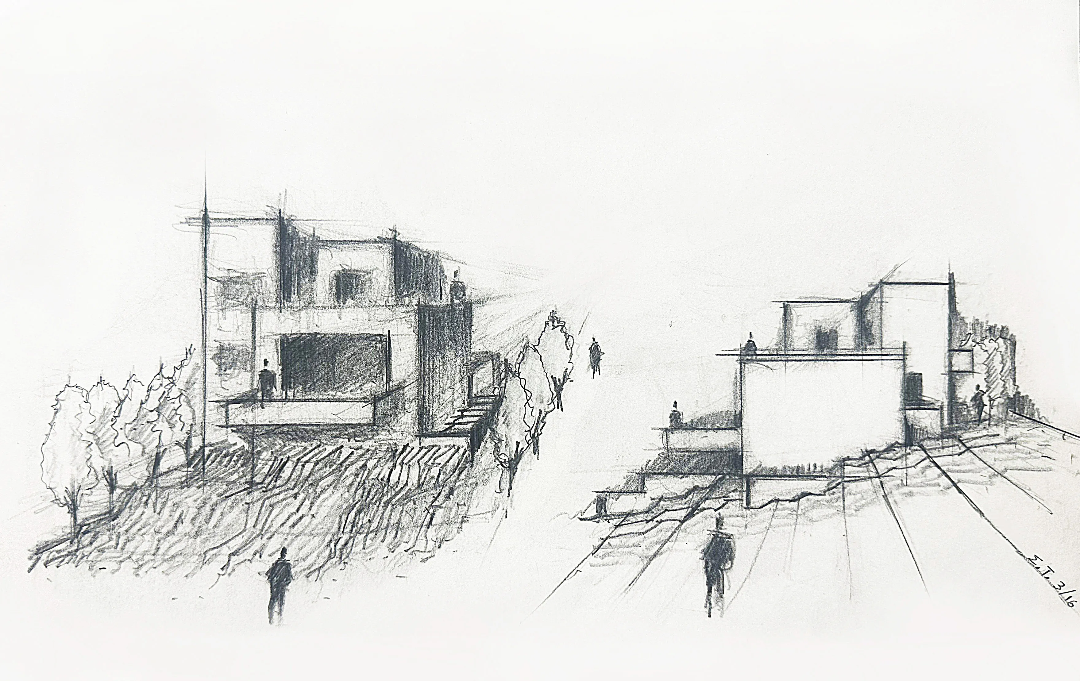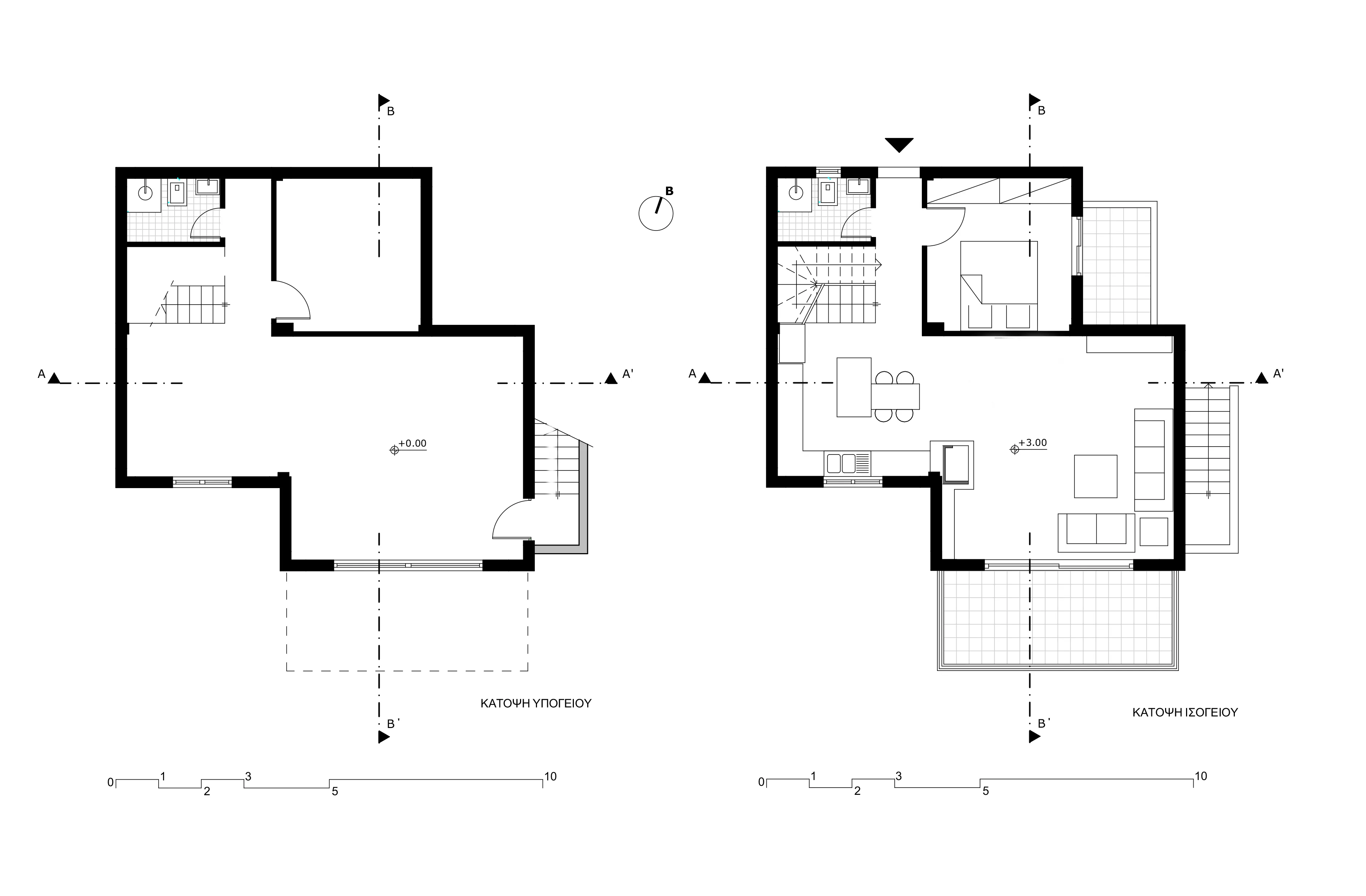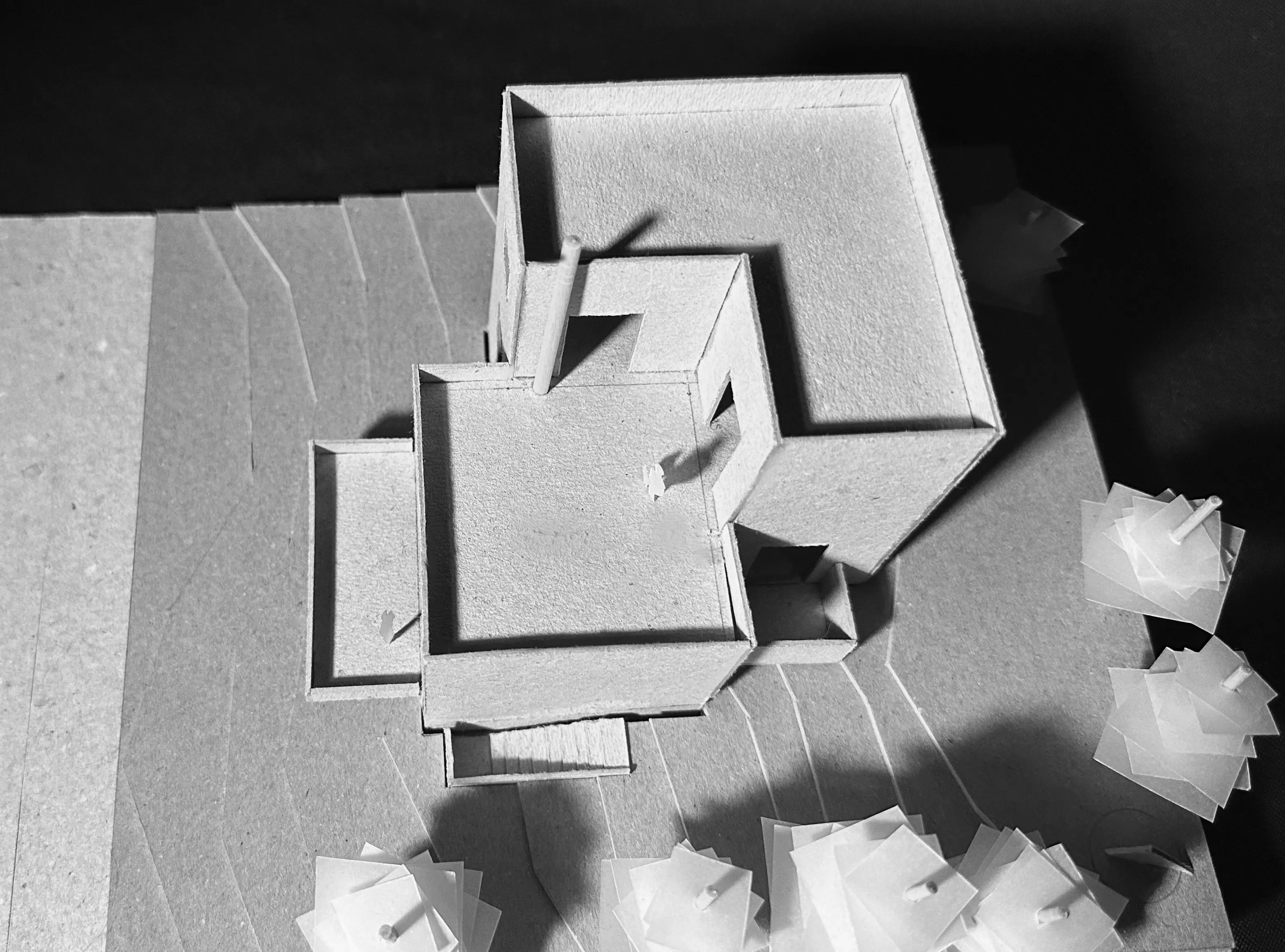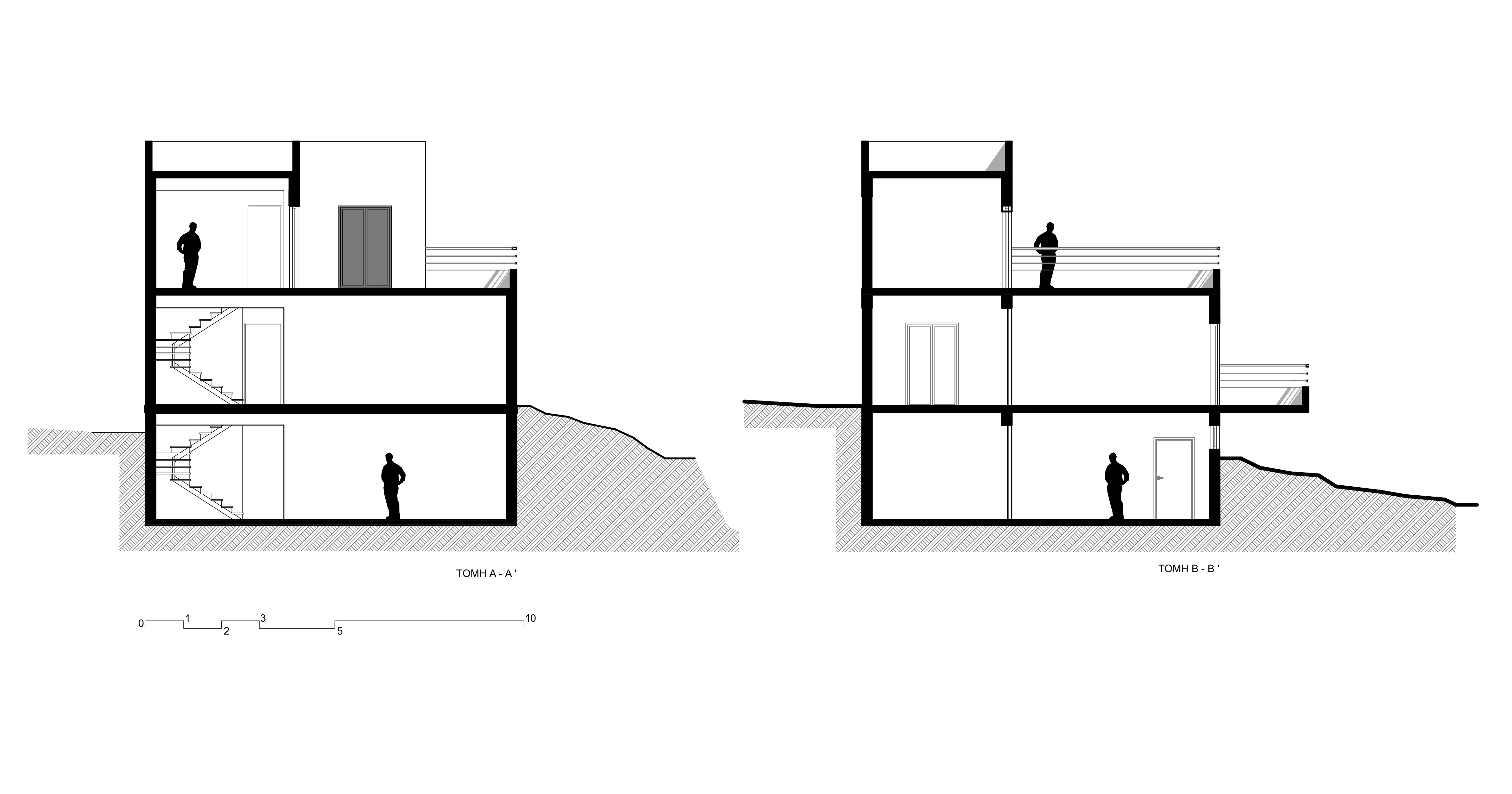 Επιπρόσθετα, η έντονη κλίση του υπεδάφους καθόρισε την δημιουργία αναβαθμών στον περιβάλλοντα χώρο ακολουθώντας το ανάγλυφο του οικοπέδου. Κύριο χαρακτηριστικό της οικίας είναι η σύνθεση γεωμετρικών όγκων, οι οποίοι διαμορφώνουν ένα στιβαρό κέλυφος.