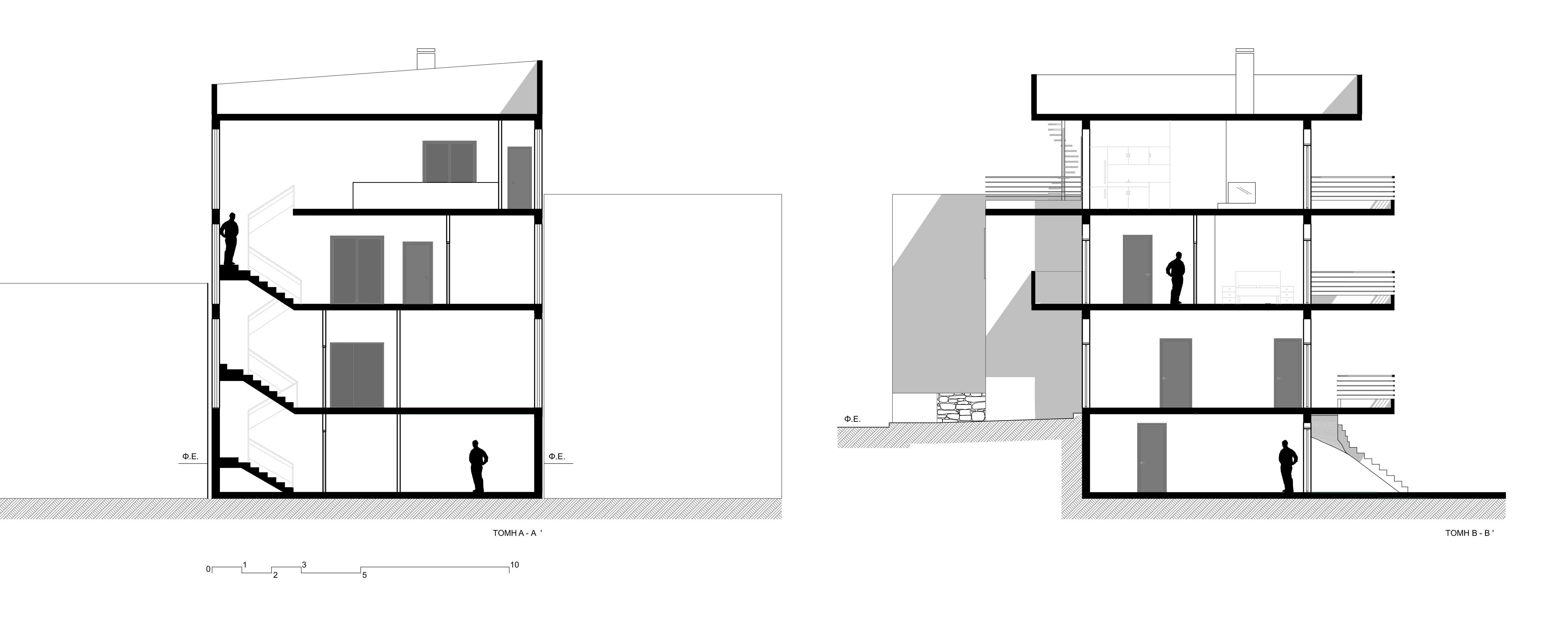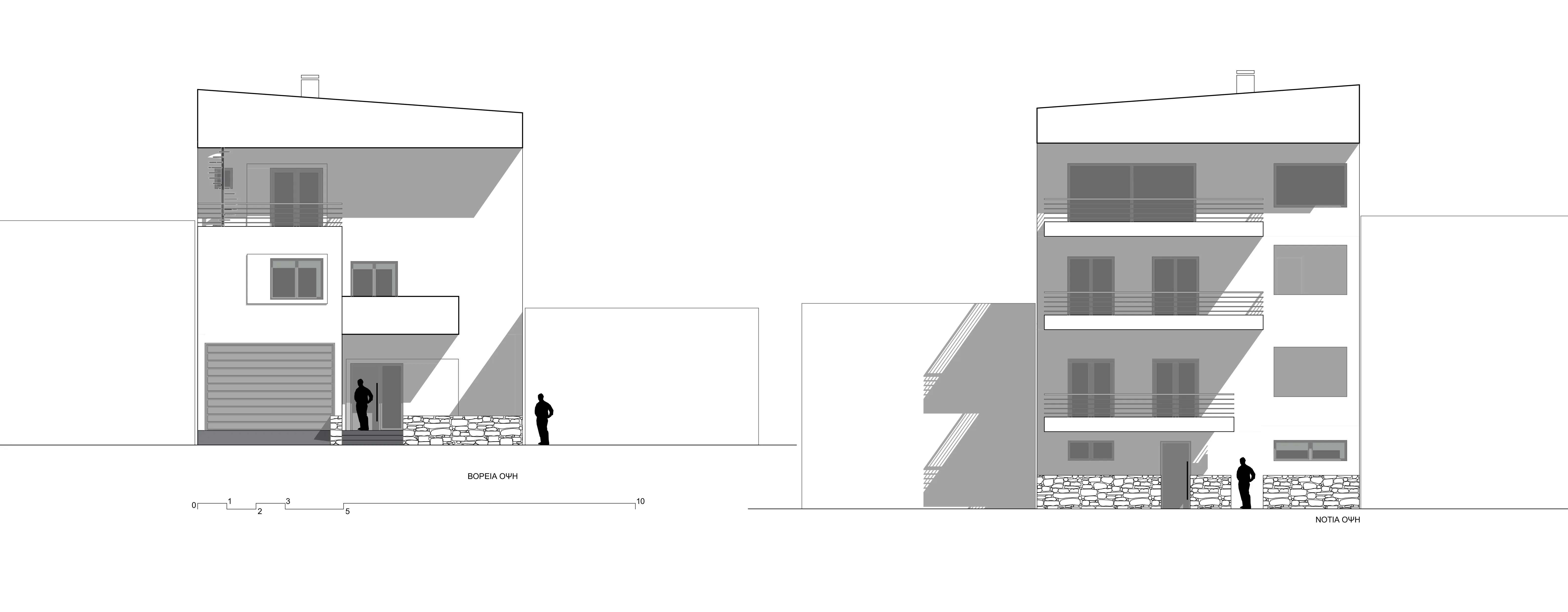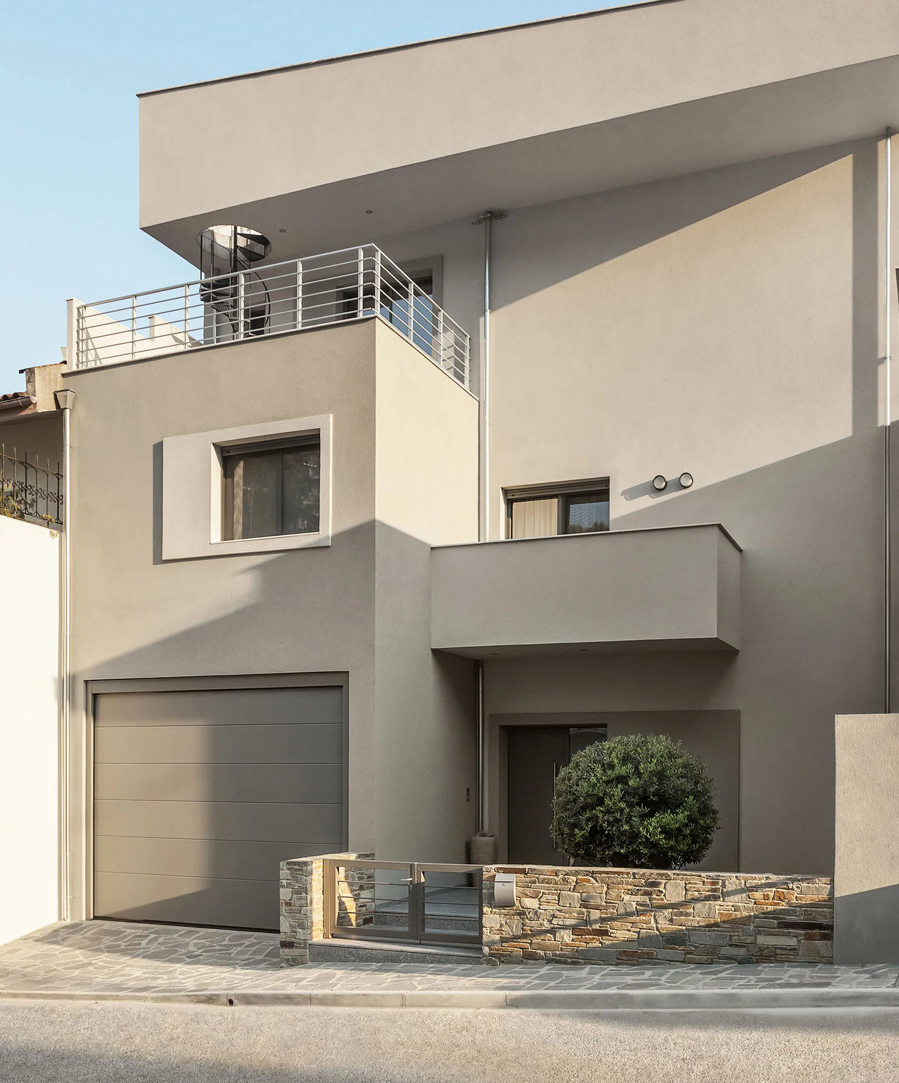 Ως βασική παράμετρος της μελέτης, αποτέλεσε το γεγονός, πως το οικόπεδο βρίσκεται στον πυκνό αστικό ιστό της πόλης και ανάμεσα σε δύο υφιστάμενα κτίσματα. Η ιδέα στηρίζεται στην δημιουργία κυβικών όγκων, οι οποίοι «απαντούν» στο μέτωπο των υπαρχόντων οικιών δημιουργώντας διαβαθμίσεις και εναλλαγές επιπέδων. Στην κύρια και βόρεια όψη δημιουργείται μια υποχώρηση του βασικού επιπέδου, η οποία συμπληρώνεται από χώρο πρασίνου. Η νότια όψη, η οποία κατευθύνεται προς τη θάλασσα, οργανώθηκε από μεγάλους εξώστες για την φυσική εκτόνωση των ενοίκων. Η έντονη κλίση του οικοπέδου, καθόρισε τα οριζόντια επίπεδα χρήσης, έχοντας ως βασικό στοιχείο τη δημιουργία μιας κατοικίας στους δύο επάνω ορόφους. Η αρχιτεκτονική, στηρίζεται σε σύγχρονες και λιτές λύσεις, οι οποίες προσαρμόζονται στο ευρύτερο περιβάλλον. Τα βασικά υλικά τα οποία χρησιμοποιήθηκαν, ήταν τα χρωματισμένα επιχρίσματα καθώς η τοπική πέτρα Καβάλας και εσωτερικά χρησιμοποιήθηκε το ξύλο βελανιδιάς.